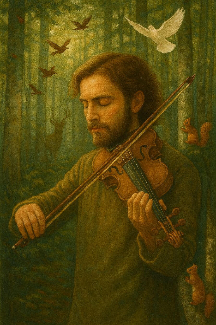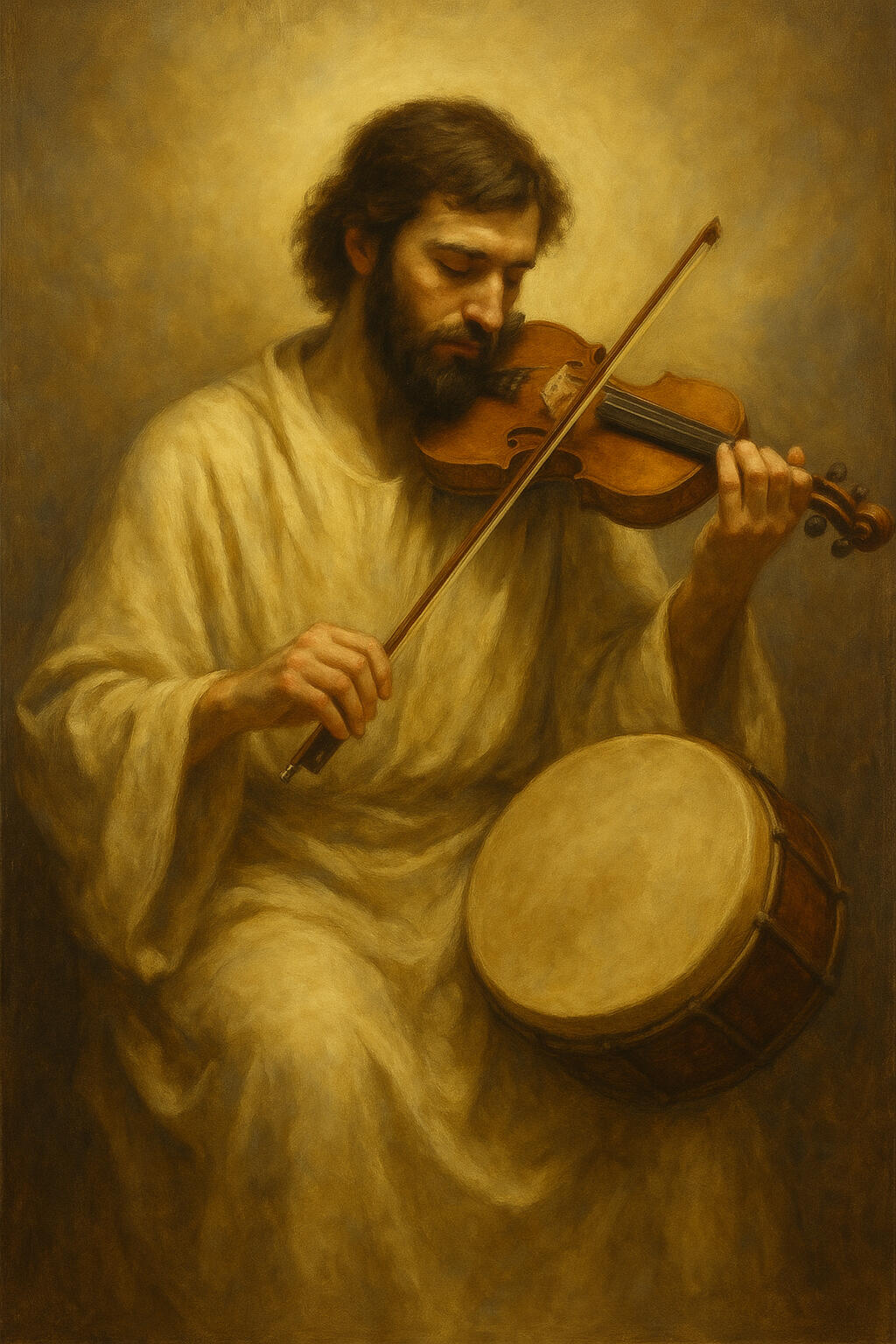 A vow — and a bow — the music he keeps.Born of Sa — the first breath of sound.