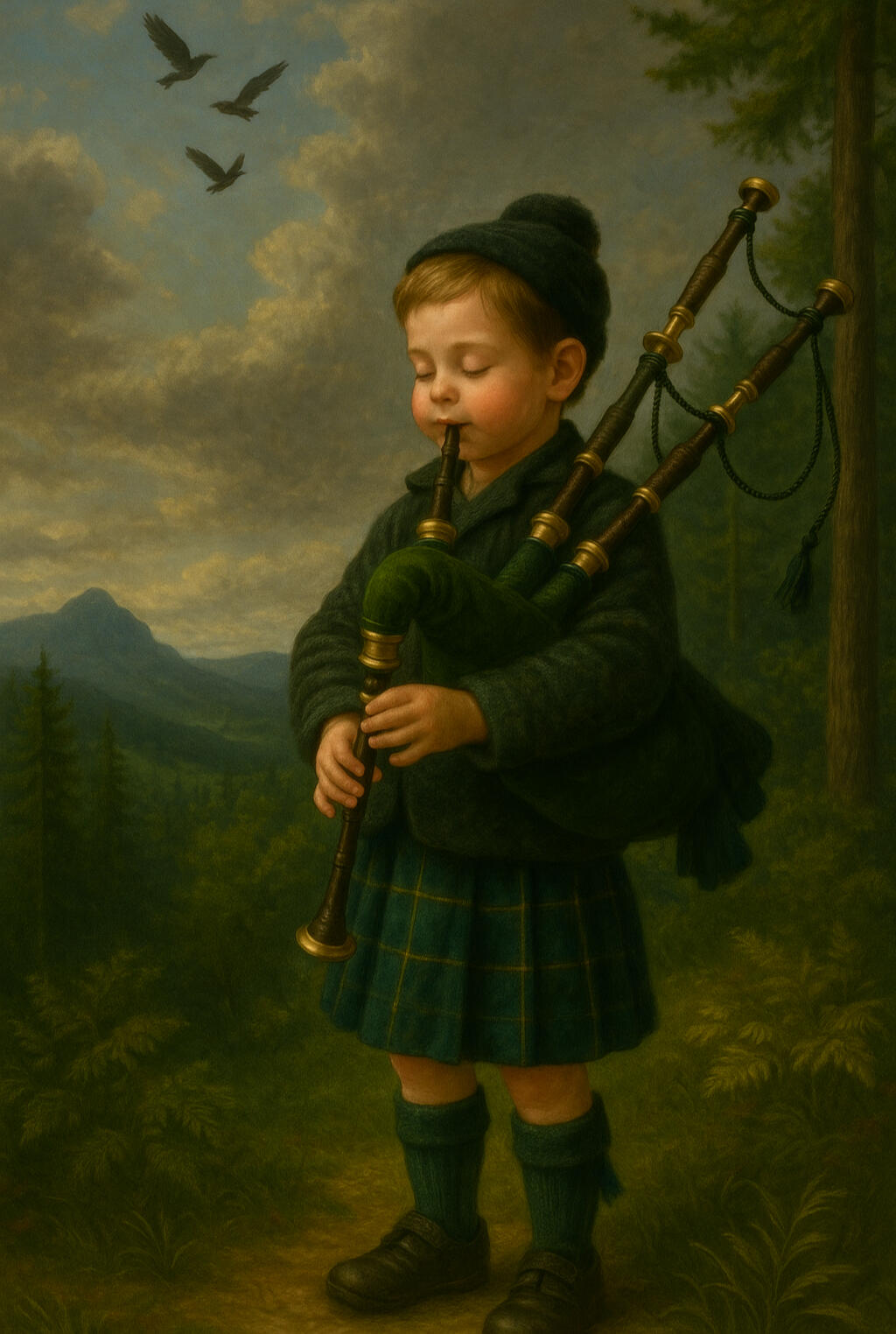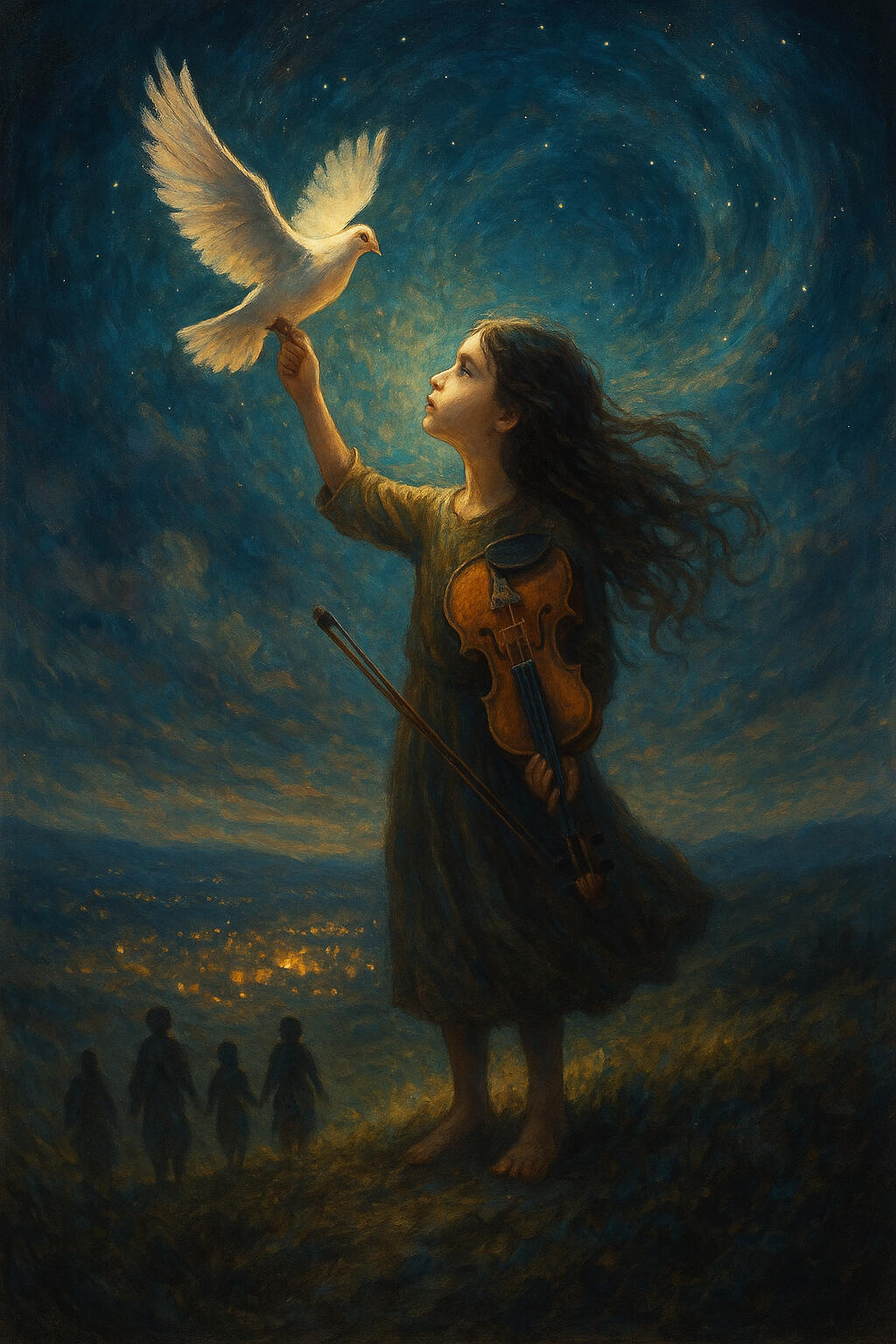 A deeply emotional and symbolic painting inspired by the messageA child stands at the center — quiet, still, and glowing softly, representing innocence and truth.Musical elements — faint outlines of a violin and drum swirl subtly through the scene like mist or spirit, not dominating but supporting, like background memory or heartbeats.Wings — almost like light or clouds — extend behind or above the child, symbolizing protection, voice, and transcendence.A war-torn landscape fades behind them: bombed buildings, ash skies, or rubble — it’s soft and not gory, but unmistakably present. Yet, it's distant.Light flows toward the child, forming a gentle path — as if truth and love are coming down from the sky or rising from the earth to meet them.Rain-like sparkles of falling petals - the line: “it will fall like rain on every place where a child waits for peace.”A painting of resilience, remembrance, and pure spirit. The song is present in the silence of the scene — not loud, but eternal.