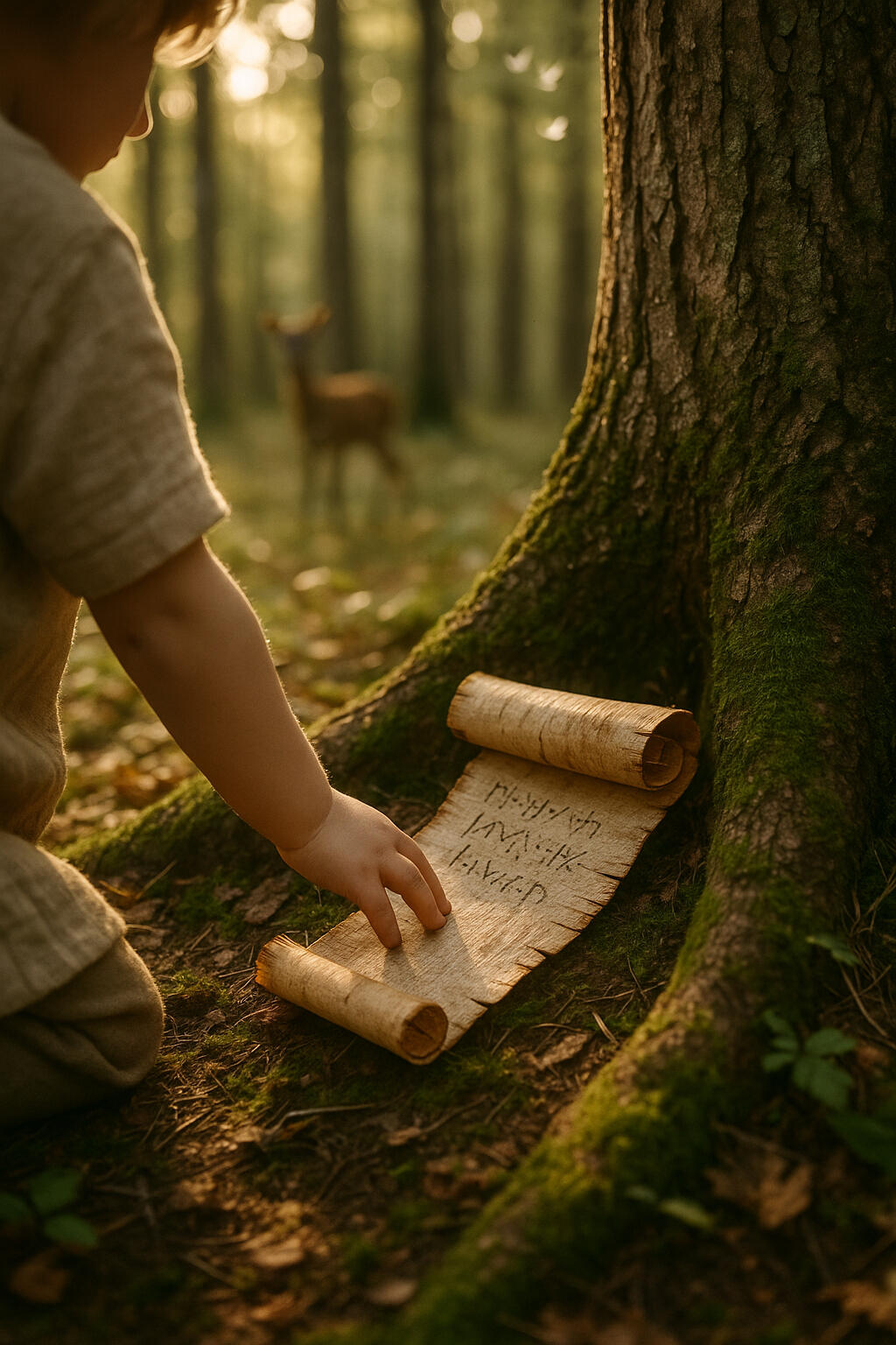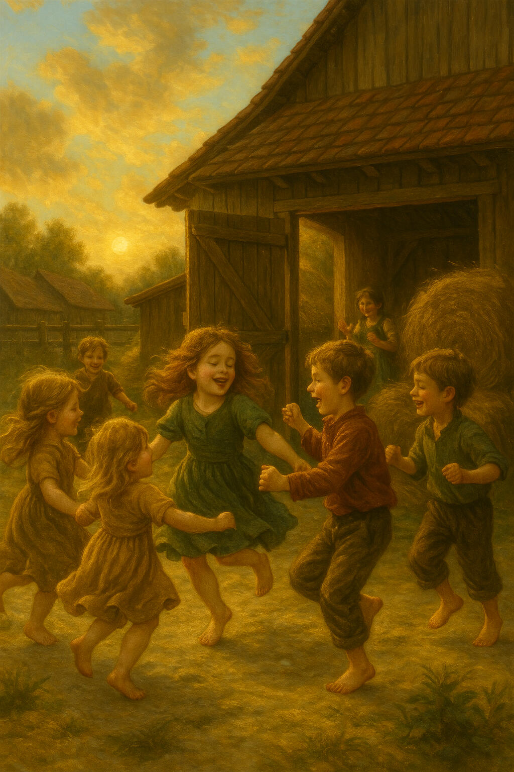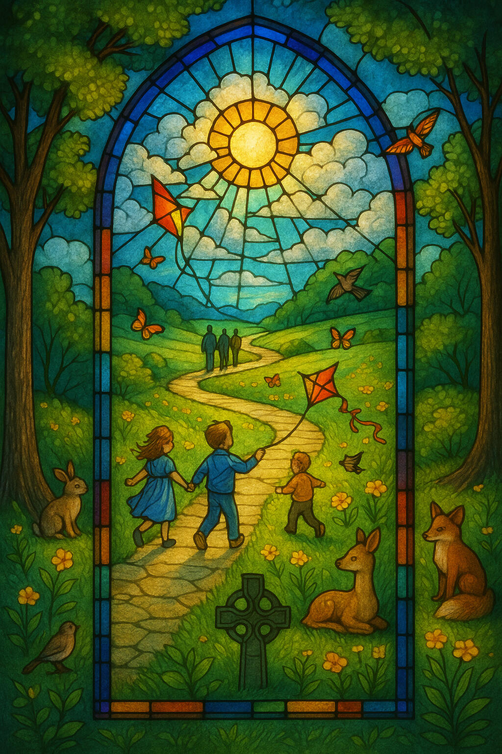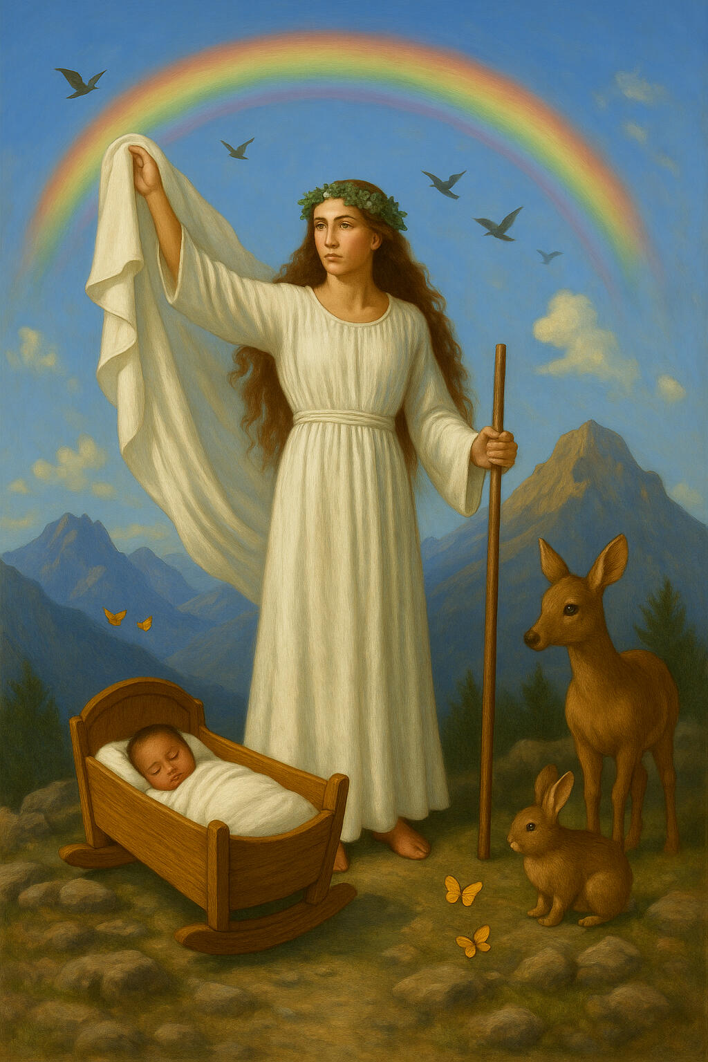 A classical child’s angel sings gracefully in the sky, bathed in soft silver light.Her flowing robes ripple as if falling upward from the child’s eye into the starlit sky, and she leans forward in gentle song — her voice imagined as descending on the breeze.Below, a child with hands in prayer, the angel a memory of ancestors, in the meadow with wildflowers — the scene from heaven to earth.The atmosphere feels sacred, serene, and protective — as though her song is a blessing poured over the world.